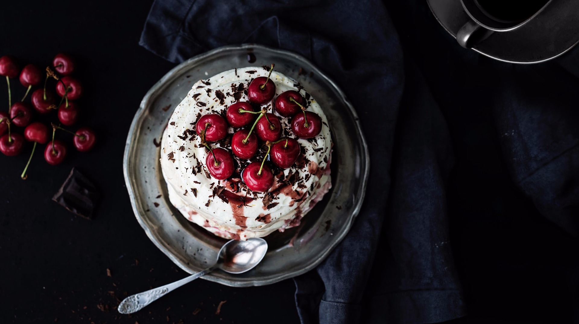 Bizcocho rico en chocolate negro, relleno de suave de crema de frambuesa, cubierto con ganache y decorado con fresa fresca